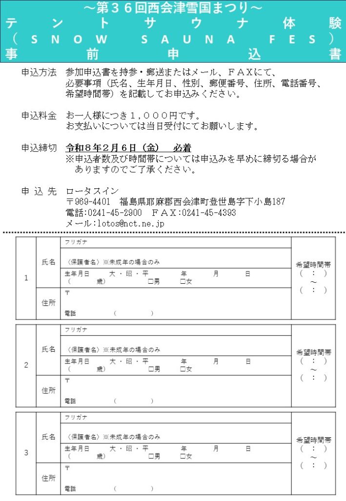 2026.01.13 令和8年2月8日(日)テントサウナ体験開催 第36回西会津雪国まつりのイベントの一環として 令和8年2月8日(日)に「テントサウナ体験」を開催いたします。 皆様のご参加をお待ちしております。(事前に申込が必要となります。)