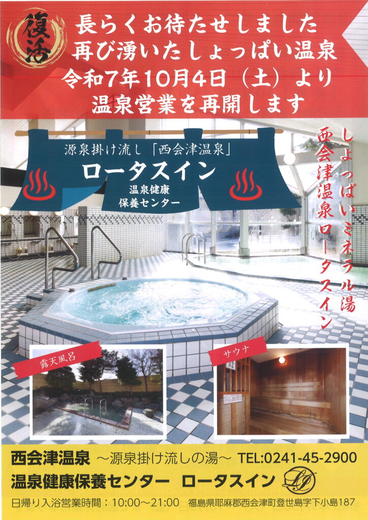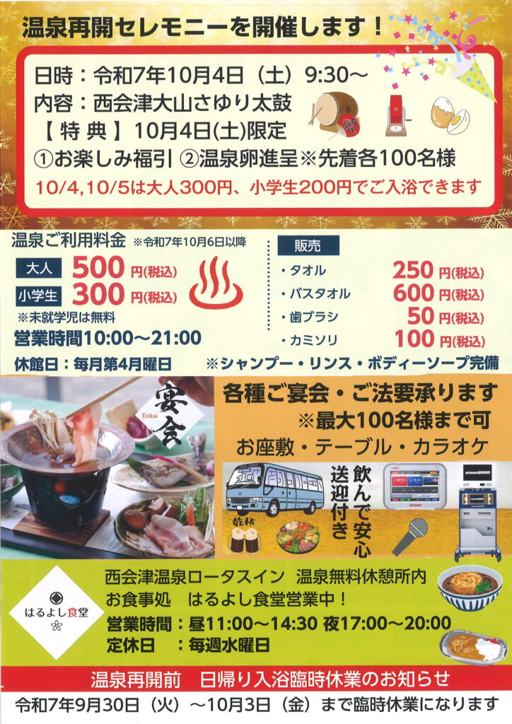 【重要なお知らせ】令和7年10月4日(土)より温泉営業を再開いたします