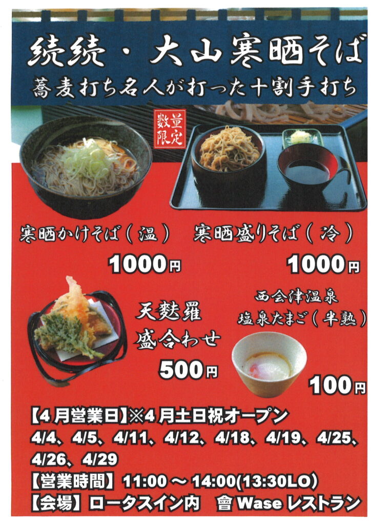 レストラン會waseにて、「大山寒晒そば」をご提供中です。